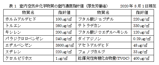 1990年代頃、日本の住宅は、快適性や省エネルギー性をすすめる中で高気密・高断熱化してきた結果、室内における化学物質の空気汚染が問題となりました。そこで厚生労働省は、快適で健康的な室内空間を確保する目的に室内濃度指針値を設定しました(表1)。