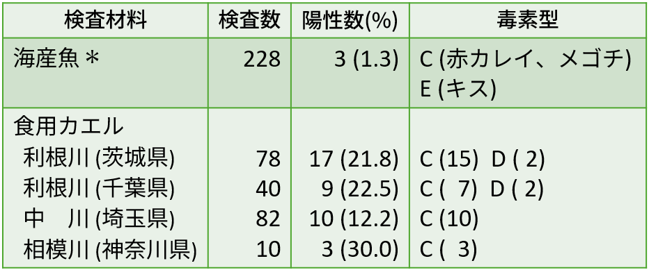 なお、魚市場の側溝などの泥土中についてもボツリヌス菌の検索を実施したところ、1件からC型が検出され、搬入された魚類や食用カエルからの汚染が考えられた。