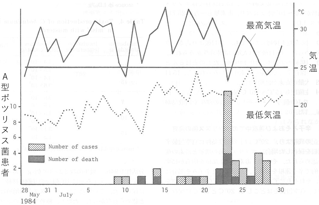 A型ボツリヌス菌食中毒患者の発生と気温の変動を(図2)に示した。当時の熊本県の気温は例年と異なり2~3℃高く、ほとんどの日で最高気温が25℃を上回り、真空包装辛子蓮根におけるA型ボツリヌス菌毒素の産生が良好であったと考えられる。