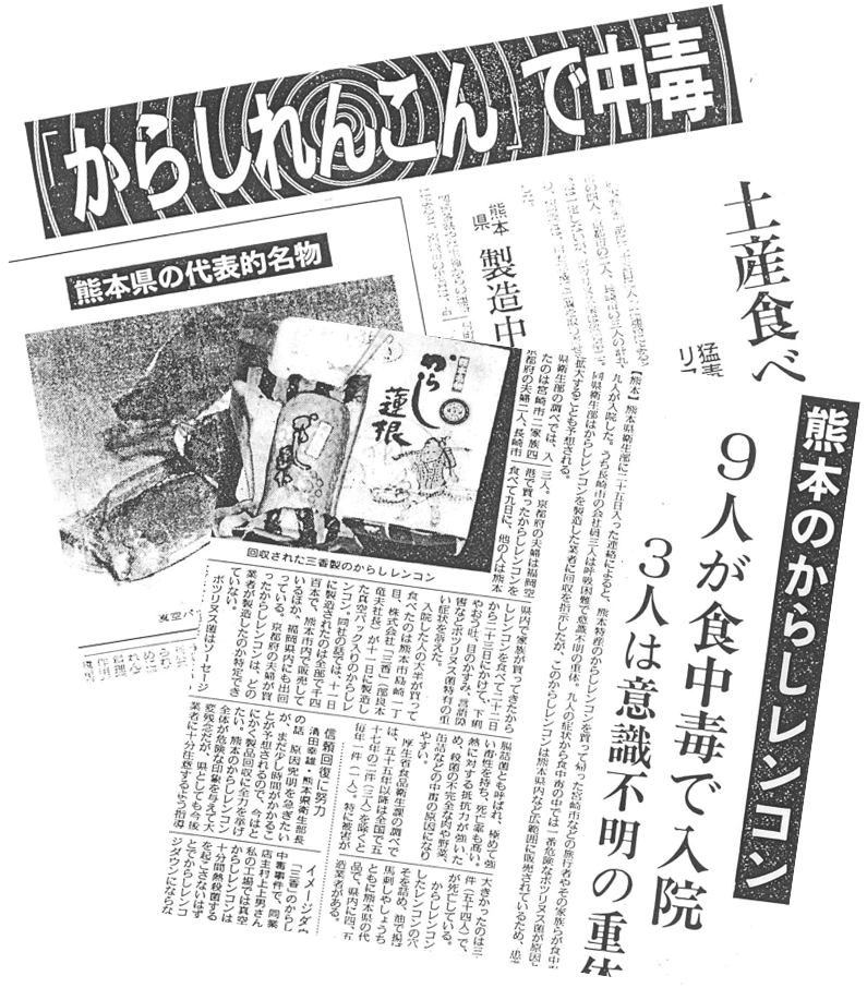 初発の発見:宮崎県の医師は、1969年に輸入キャビアによるB型ボツリヌス菌食中毒患者を診断した経験があり、今回6月22日に来院した4名の患者に以前の同型菌症状と類似の嘔気、言語障害、神経障害、呼吸困難が認められたことからボツリヌス症と診断し、保健所に届けられ、調査が開始された。患者の血清からはA型ボツリヌス毒素が証明されたし、患者が喫食した熊本産の真空包装の「辛子蓮根」からもA型ボツリヌス菌が検出され、熊本県の辛子蓮根製造工場が特定された。