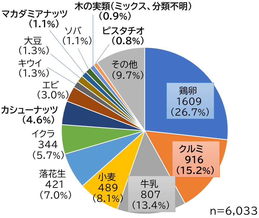 調査対象とした6,033例のうち鶏卵に次いで、クルミ、牛乳、小麦による症例が多い結果となっている。特に木の実類については、クルミ、カシューナッツ、マカダミアナッツなどの合計は、全体の24.6%(1,484例)を占め、鶏卵(26.7%)に次いで多い。これは健康志向の高まりと相まって、クルミやカシューナッツなどを使用したケーキや菓子類の消費量が増加していることも一因と考えられる。